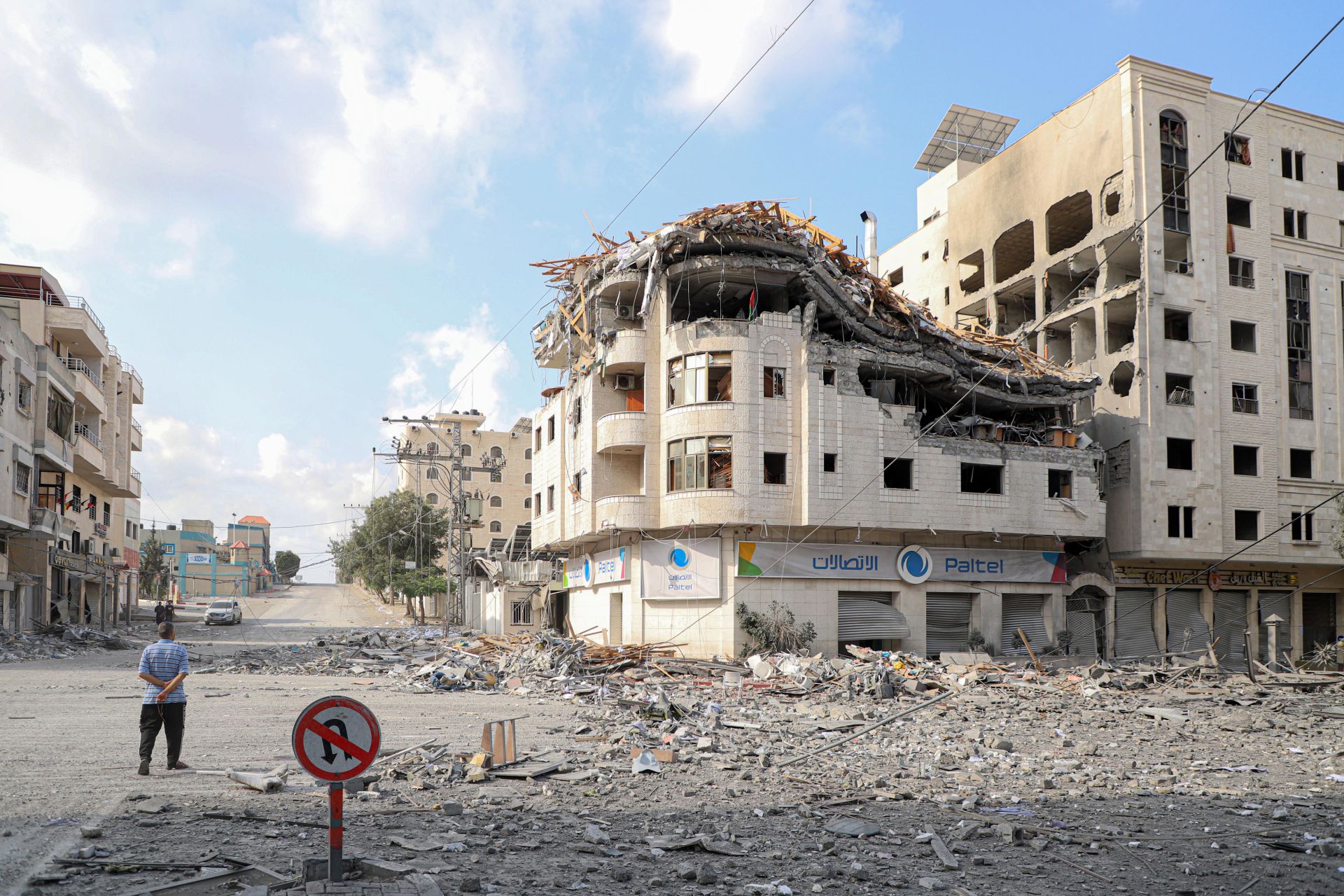 10月10日,在加沙城,人们走过被以色列空袭炸毁的建筑废墟。新华社发(里泽克·阿卜杜勒贾瓦德 摄)