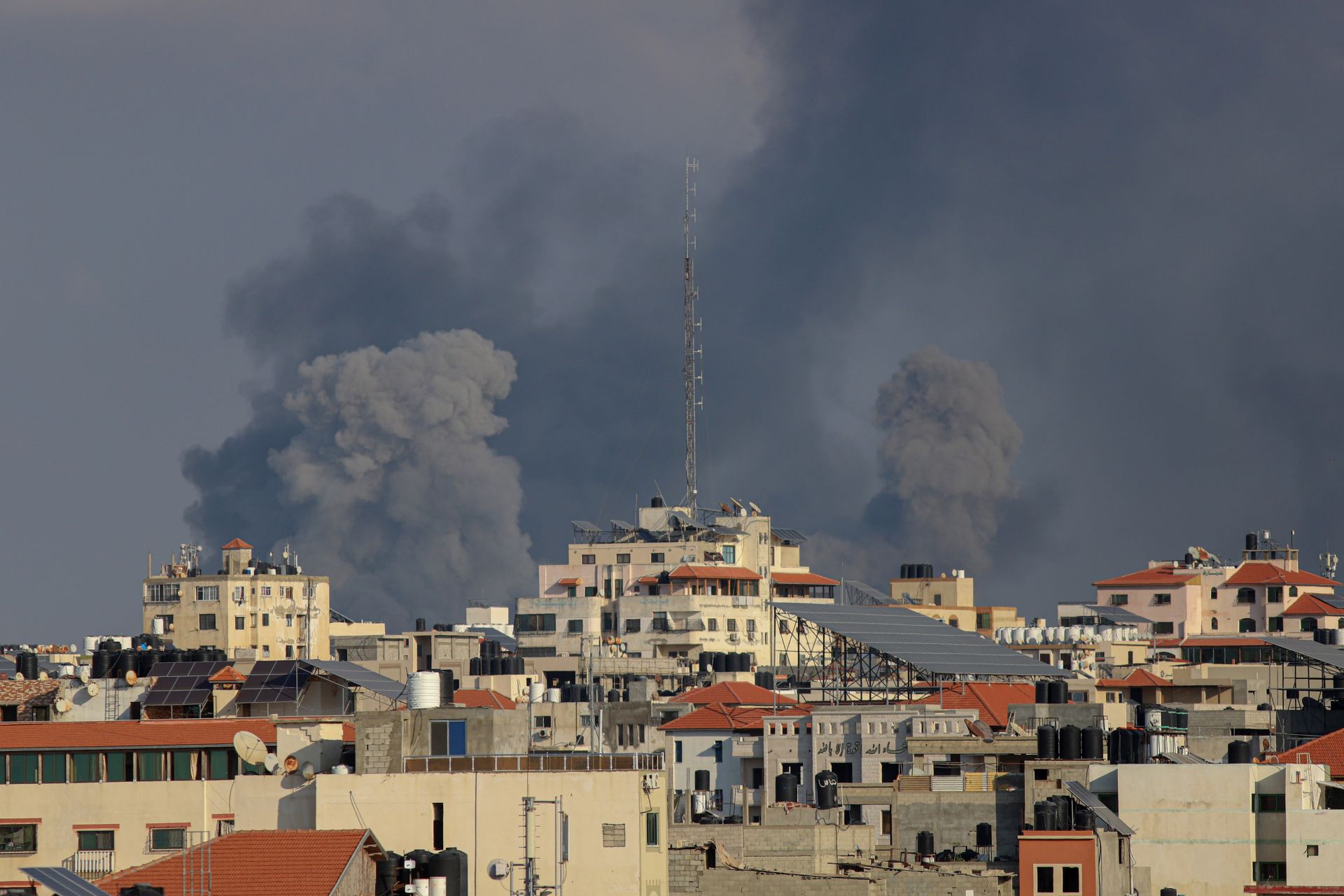10月10日,加沙城的建筑遭以色列空袭后升起浓烟。新华社发(里泽克·阿卜杜勒贾瓦德 摄)