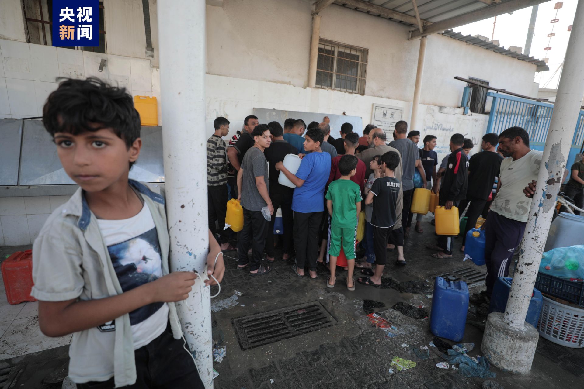 △当地时间10月14日,沙地带南部城市汗尤尼斯,大批流离失所的巴勒斯坦人在一个供水站前等待。