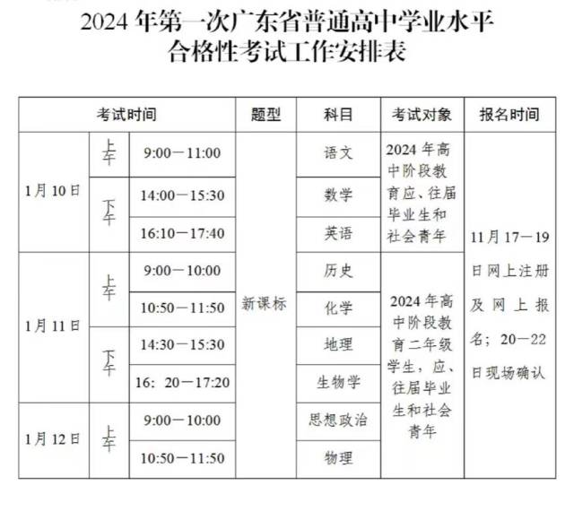 10月16日,广东省教育考试院发布《关于做好2024年第一次广东省普通高中学业水平合格性考试报名工作的通知》,本次合格性考试报名安排在2023年11月17日至22日,考试将在2024年1月10日至12日进行。