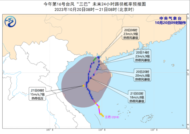 在17日14时,原位于海南岛南部海面的热带扰动加强为热带低压,并在18日14时加强为今年第16号台风“三巴”(来源:中国澳门;意义:澳门旅游名胜)。到19日9时前后,“三巴”在海南省东方市沿海地区登陆。因此,此次也是再次登陆。