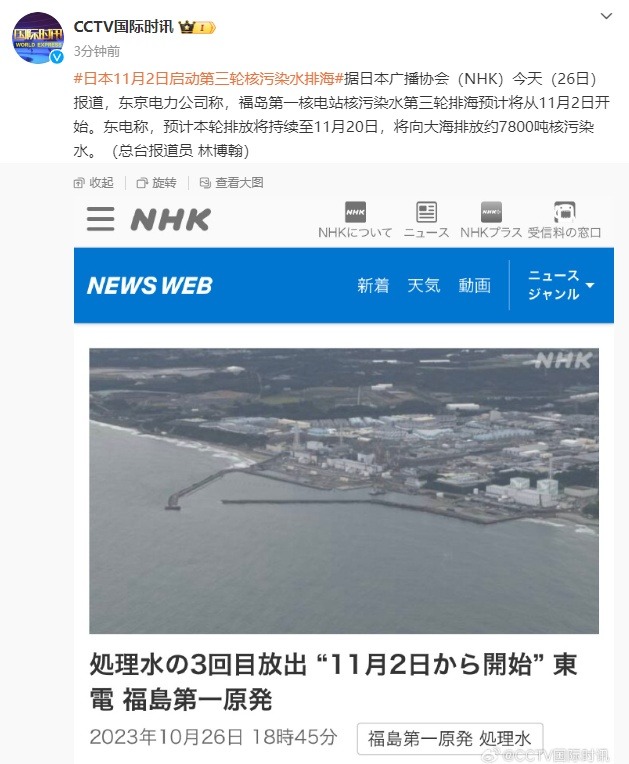 据日本广播协会(NHK)今天(26日)报道,东京电力公司称,福岛第一核电站核污染水第三轮排海预计将从11月2日开始。东电称,预计本轮排放将持续至11月20日,将向大海排放约7800吨核污染水。