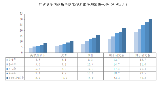 高学历人才薪酬优势显著,人才总量聚集效应凸显。总体来看,广东省职工薪酬水平与学历、工作年限均呈正相关关系,即职工的学历越高、工作年限越长,平均薪酬水平越高。