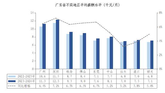 与去年相比,深圳薪酬增速全省第一,同比增长7.2%,增幅同比提高0.7个百分点。其次是广州、珠海、佛山、东莞,同比增长在6%~7%之间。再次是中山、韶关,同比增长5%左右。湛江、汕头较低,同比增长不足4%。