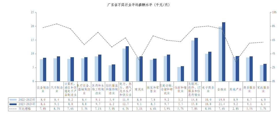 与去年相比,汽车制造业,电子商务业,设备制造业,互联网、软件、IT服务和信息传输业,计算机、通信和其他电子产品制造业,医药和生物工程制造业平均薪酬增长较为明显,分别为8.3%、8.0%、7.8%、7.8%、7.6%、7.1%,其中四个行业为制造业,可见广东制造业“压舱石”“顶梁柱”作用日渐凸显;而房地产业、建筑业受宏观调控政策影响,行业薪酬增长持续放缓,同比分别增长2.8%、3.1%。