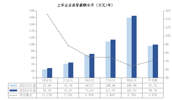 2022年度上市企业高管薪酬增长总体放缓,较低分位数增速明显领先。2022年度上市企业高管平均薪酬为99.40万元,同比增长4.07%,增幅同比下降2.04个百分点。从分布水平来看,上市企业高管平均薪酬(99.40万元/年)是P50(71.64万元/年)的1.39倍,与2021年的1.40倍相比基本持平;P90(185.03万元/年)是P10(29.59万元/年)的6.25倍,与2021年的7.01倍差距相比有所缩窄。