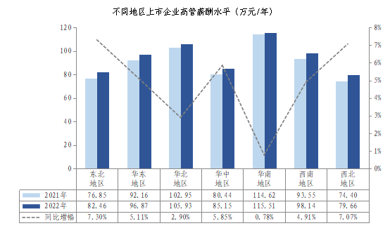 从地区分布来看,各地区高管薪酬水平同比均有不同程度的提升。其中,华南地区上市企业高管薪酬依然处于领先地位,平均年薪为115.51万元/年,同比增长0.78%;华北地区保持第二,平均年薪为105.93万元/年,同比增长2.90%,增幅较去年相比有所放缓;西南地区仍位居第三,为98.14万元/年,同比增长4.91%,增幅与去年基本一致;东北地区与西北地区的薪酬水平虽然在地区中排名靠后,但增幅较高,分别为7.30%、7.07%。