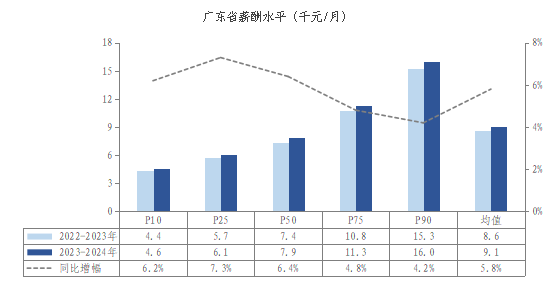 全省薪资增幅与经济预期走势基本一致。根据报告,广东省2023-2024年度平均月薪为9100元,同比增长5.8%,与全省2023年地区生产总值预期增长5%以上的态势基本一致。从分位值来看,较低分位值同比增幅高于较高分位值,即低收入群体薪酬增长更加明显,劳动者收入分配差距呈收窄趋势,侧面反映出全省扎实推进共同富裕取得一定成效。