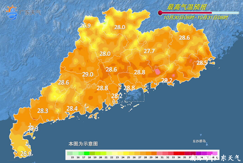 天气实况:29日,粤西、云浮、佛山等市县出现了中到大雨,部分市县出现了暴雨或大暴雨;我省最高气温分布:梅州、南部市县26℃~29℃,其余大部22℃~26℃,江门台山录得全省最高气温29.0℃。