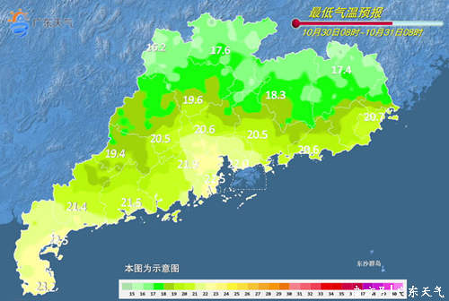 预计,30日大部云量减少,白天最高气温回升,31日到11月1日大部晴天,早晚清凉、昼夜温差大,部分市县早晨有轻雾;2日粤西市县云量增多,大部分市县早晨有轻雾。另外,30-31日,我省中东部海面有6-7级东北到东风。