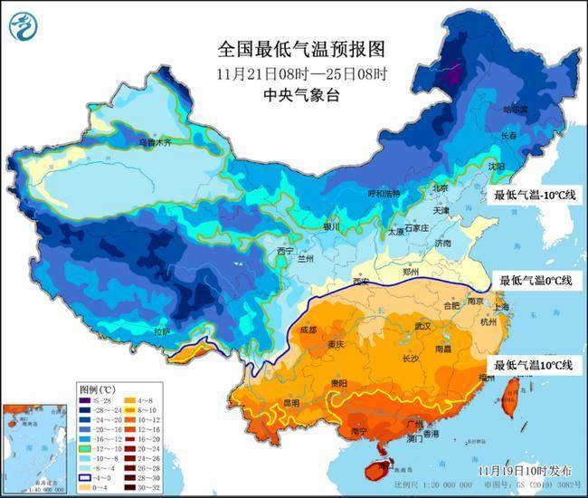 大风降温预报:21日至24日,长江中下游及以北地区有4~6级偏北风,阵风7~8级、局地9级;过程降温幅度有6~10℃,其中内蒙古中东部、华北西部和北部、东北地区、山东半岛等地的部分地区降温幅度可达12~16℃,局地超过16℃。25日早晨,最低气温0℃线将位于江苏中南部、安徽北部至河南南部、陕西南部一带;内蒙古东部、吉林北部、黑龙江等地最低气温在-24~-20℃,局地低于-24℃,较常年同期偏低5~8℃。23日至25日,东部和南部海区先后有6~8级风,阵风9~10级。