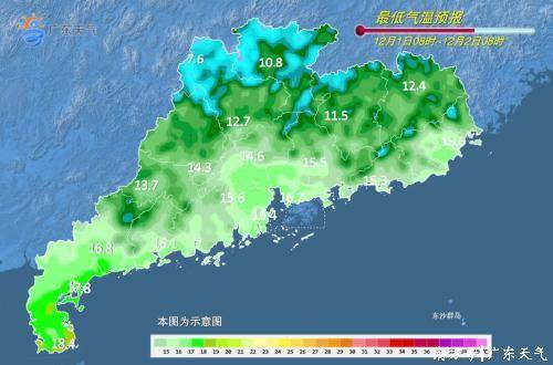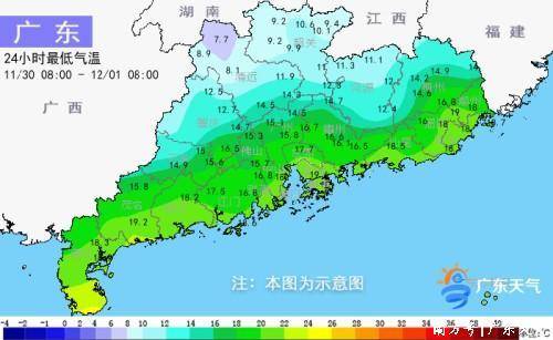 12月1日早晨,受冷空气影响,广东大部最低气温较30日明显下降,最低气温具体分布:粤北的偏北和肇庆北部市县介于7~13℃,南部沿海市县介于18~22℃,其余大部分市县介于14~18℃。