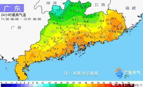 天气实况:30日白天到12月1日早晨,广东大部多云,韶关、清远、肇庆北部、河源北部市县出现了小雨。受冷空气影响,30日白天中北部市县最高气温出现不同程度下降,最高气温:清远、韶关、河源北部、肇庆北部介于16~20℃,粤东、珠三角南部和粤西市县24~27℃,其余市县20~24℃,珠海斗门录得全省最高气温27.4℃。