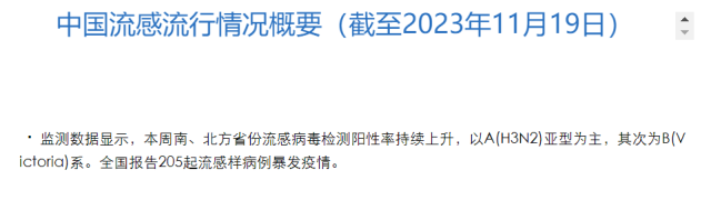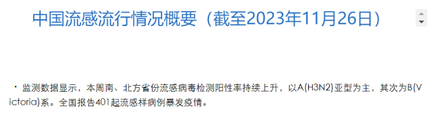 中国国家流感中心网站消息,该网站发布中国流感流行情况概要(截至2023年11月26日)。监测数据显示,本周南、北方省份流感病毒检测阳性率持续上升,以A(H3N2)亚型为主,其次为B(Victoria)系。全国报告401起流感样病例暴发疫情,此前一周该数字为205。