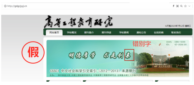 有的仿冒网站内容粗糙、错误明显,如期刊《高等工程教育研究》的仿冒网站将“求是创新”错写为“求是创亲”。