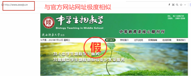 1.仿冒域名地址。利用与官方网站高度相似的域名地址,混淆视听,如期刊《中学生物教学》官网地址为zxswjx.com,仿冒网站地址为zxswjx.cn。