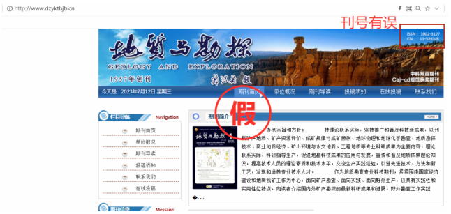 有的仿冒网站刊号与期刊实际不符,如期刊《地质与勘探》国内统一刊号为11-2043/P,仿冒网站展示的却是其他期刊号。
