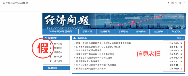 2.“克隆”页面内容。一些仿冒网站基本照搬照抄官方网站页面内容,从期刊导读、投稿指南到在线投稿,各栏目一应俱全,看起来有模有样。但细究却发现,有的仿冒网站内容老旧,更新不及时,如期刊《经济问题》的仿冒网站,网站新闻停留在2016年、2017年。