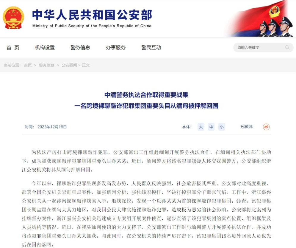 今年以来,裸聊敲诈犯罪呈现多发高发态势,人民群众反映强烈,社会危害极其严重。公安部对此高度重视,部署全国公安机关紧盯重点案件,加强研判分析,强化线索摸排,坚决打掉犯罪分子嚣张气焰。工作中,浙江嘉兴公安机关从一起涉网裸聊敲诈线索入手,顺线深挖,发现一个以孙某某为首的裸聊敲诈犯罪集团。经查,该犯罪集团长期盘踞在缅甸大其力地区,对我国公民大肆实施裸聊敲诈犯罪,造成极为恶劣的社会影响。公安部将此案列为挂牌督办案件,浙江嘉兴公安机关迅速成立专案组开展案件侦查,逐步查清了该犯罪集团的窝点位置、组织框架及人员结构等情况。近日,在我驻缅甸使馆的大力支持下,公安部派出工作组与缅甸警方开展警务执法合作,并成功将该犯罪集团重要头目孙某某抓获。与此同时,在公安机关的持续严厉打击下,该犯罪集团18名境外回流人员也先后在国内落网。