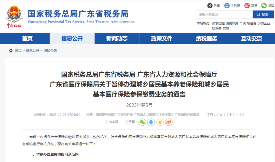 据国家税务总局广东省税务局网站消息,12月26日,国家税务总局广东省税务局、广东省人力资源和社会保障厅、广东省医疗保障局发布《关于暂停办理城乡居民基本养老保险和城乡居民基本医疗保险参保缴费业务的通告》。