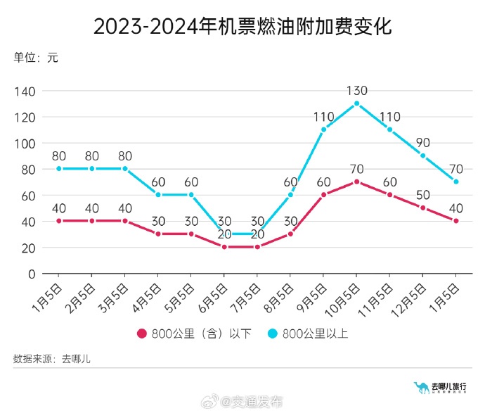 12月30日,记者从去哪儿获悉,自2024年1月5日(出票日期)起,成人旅客:800公里(含)以下航线每位旅客收取40元燃油附加费,800公里以上航线每位旅客收取70元燃油附加费,相较于调整前分别降低了10元和20元机票燃油附加费连续三个月下降。2024年春运即将到来,燃油附加费降低,将节省旅客出行成本。从目前预订情况来看,2024年春节国内热门目的地为上海、北京、深圳、广州、哈尔滨、成都、海口、昆明、三亚、杭州。