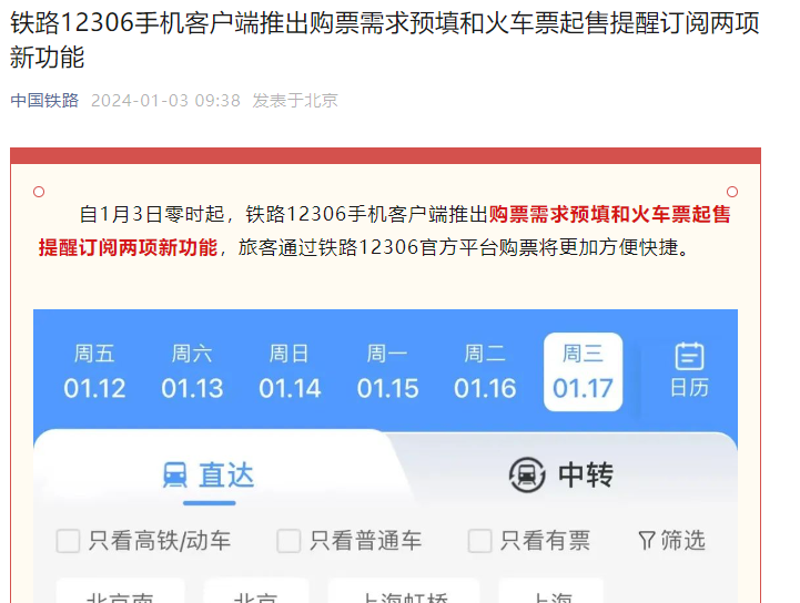 自1月3日零时起,铁路12306手机客户端推出购票需求预填和火车票起售提醒订阅两项新功能,旅客通过铁路12306官方平台购票将更加方便快捷。