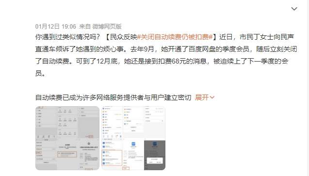 近日,“关闭自动续费仍被扣费”的话题登上热搜。一网友在2023年9月开通了某网盘的季度会员,随后立刻关闭了自动续费。可到了12月底,她还是接到扣费68元的消息,被迫续上了下一季度的会员。