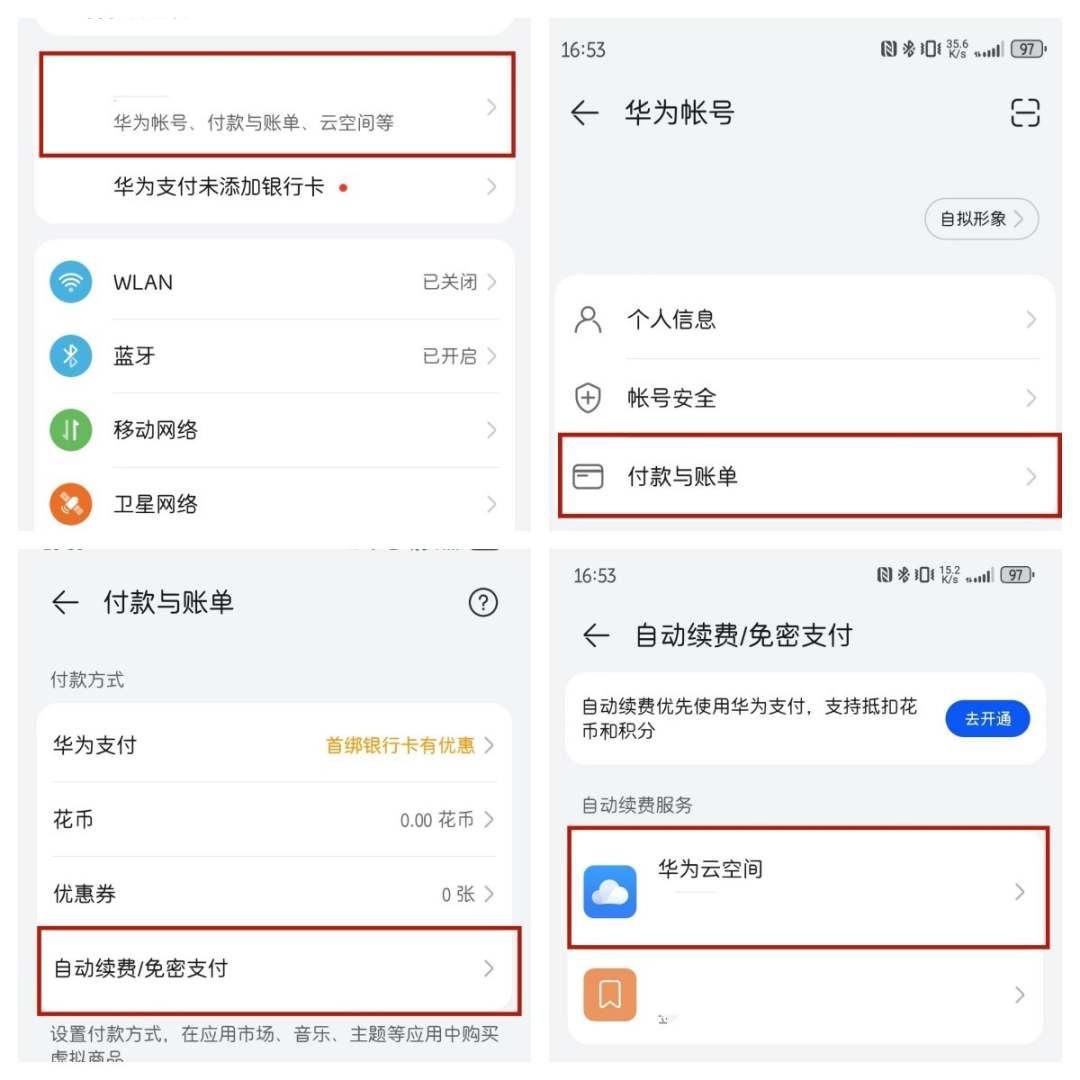 进入设置→华为账号、付款与账单、云空间等→付款与账单→自动续费/免密支付→退订APP业务即可。