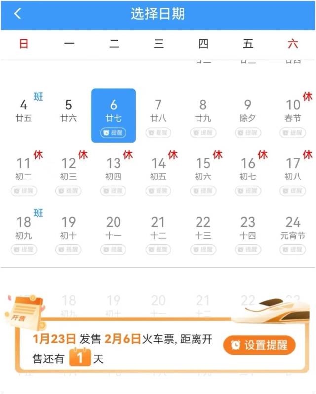 同时,火车票预售期为15天,为了防止忙起来错过起售时间,铁路12306给预售期外的时间都标上了“提醒”字样,点一下“设置提醒”,可以在手机日历中设置闹钟提醒。如果您是务工人员或者学生,现在可以预约2月8日到3月5日的车票,但兑现支付需要在乘车日期前第16天完成,进入预售期以后,学生和务工人员购票方式与普通旅客一致。