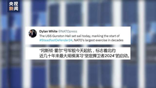 北约发言人迪伦·怀特在社交媒体上写道:“‘冈斯顿·霍尔’号军舰今天起航,标志着北约近几十年来最大规模演习‘坚定捍卫者2024’的启动。”