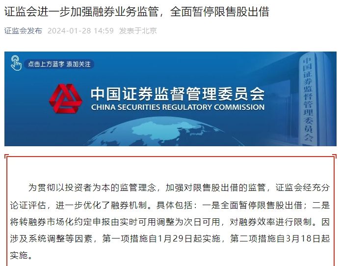 为贯彻以投资者为本的监管理念,加强对限售股出借的监管,证监会经充分论证评估,进一步优化了融券机制。具体包括:一是全面暂停限售股出借;二是将转融券市场化约定申报由实时可用调整为次日可用,对融券效率进行限制。因涉及系统调整等因素,第一项措施自1月29日起实施,第二项措施自3月18日起实施。
