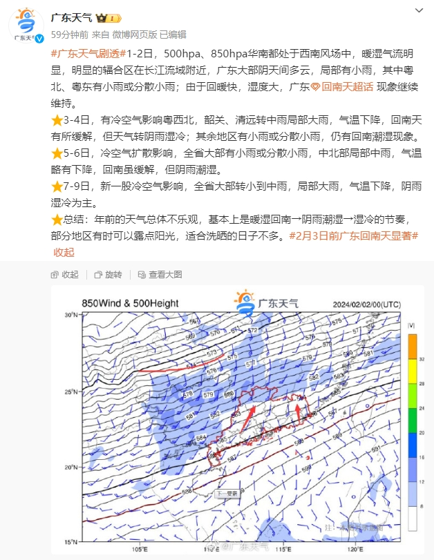 2月3日,粤北、粤东阴天有小雨或分散小雨,其余市县阴天间多云局部有小雨,粤北的北部市县、粤东市县雾和回南天有所缓解。最低气温:粤北、粤东市县13℃~16℃,其余市县17℃~20℃。
