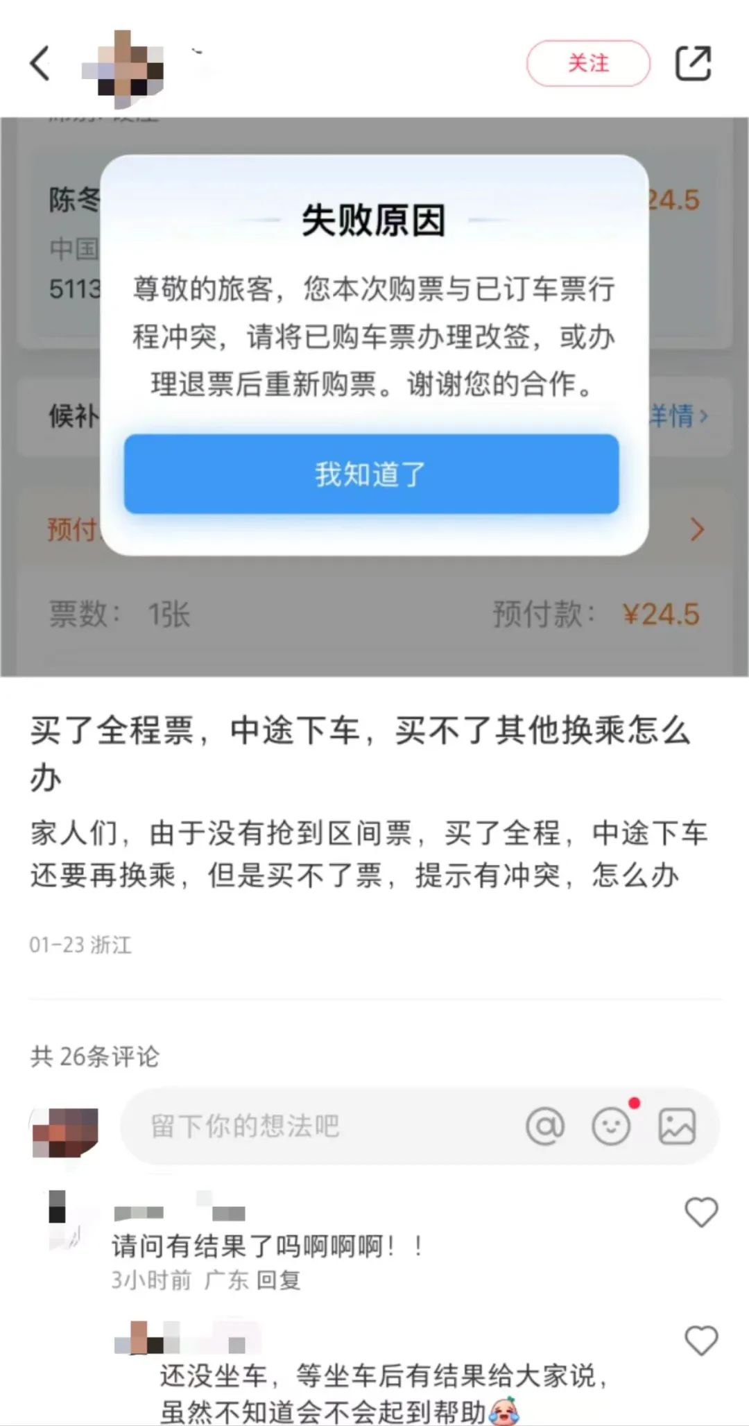 近日,还有多名网友在社交平台发文称,在12306平台买票时出现区间票开售“秒没”的情况,怀疑12306只投放全程票,故意让旅客“买长乘短”。