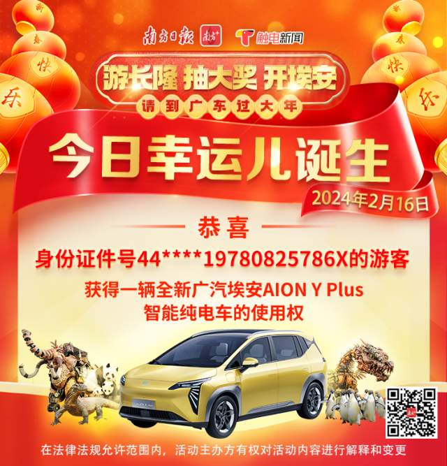 好人启好运,最暖是广东。2月16日,大年初七,由南方+、触电新闻主办的“请到广东过大年之游长隆、抽大奖、开埃安”活动开出第八个大奖。随着“广东好人”赵晓燕按下开奖键,身份证号为“44****19780825786X”的广东游客成为今日的幸运儿。她将获得一辆全新广汽埃安AION Y Plus智能纯电车的使用权。