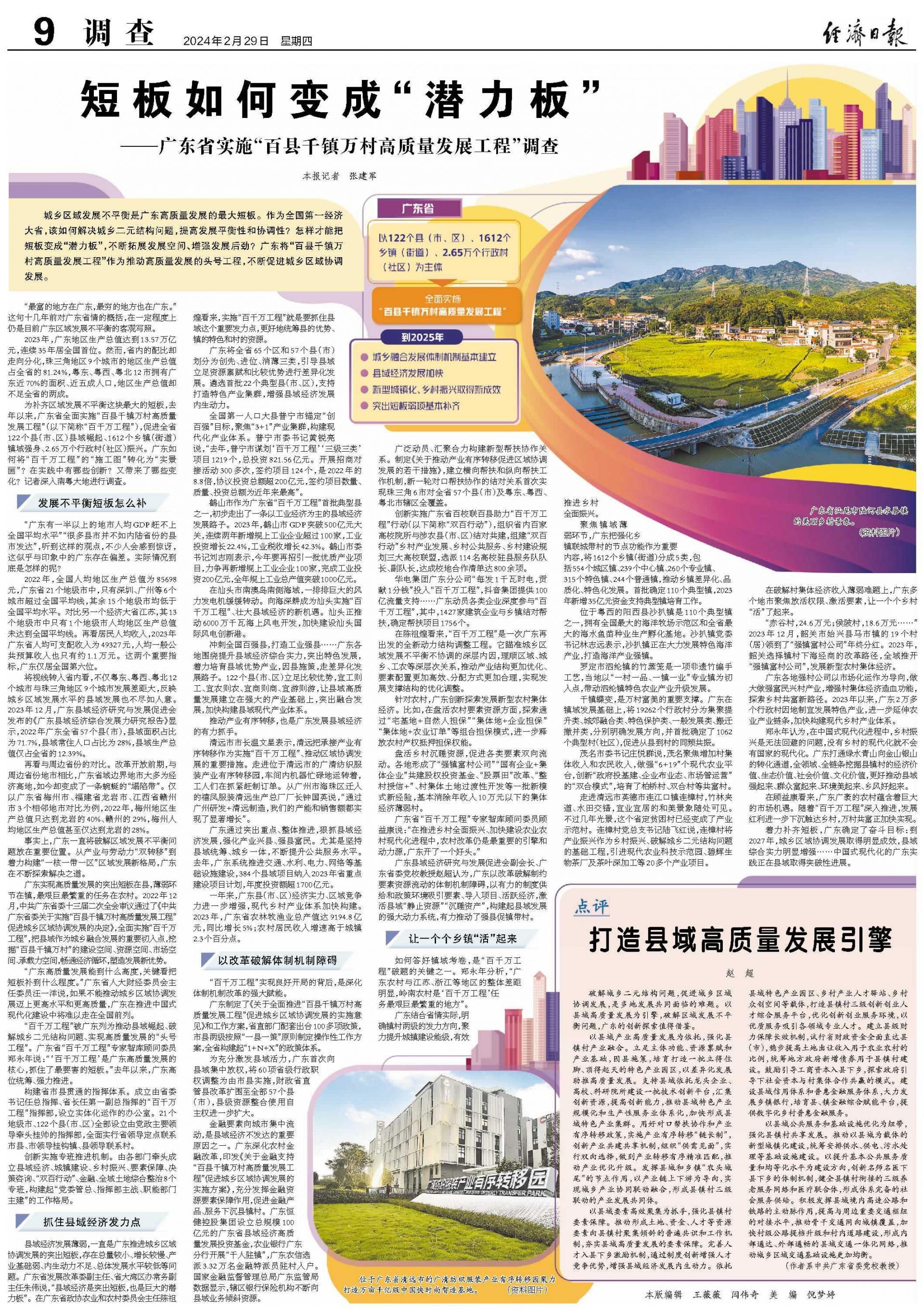 着力补齐短板,广东确定了奋斗目标:到2027年,城乡区域协调发展取得明显成效,县域综合实力明显增强……中国式现代化的广东实践正在县域取得突破性进展。