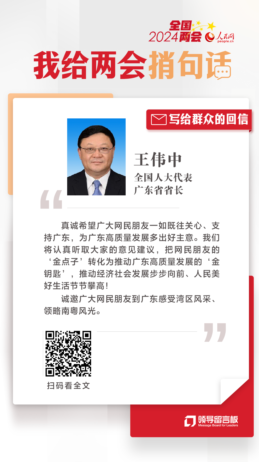 新的一年,我们将深入学习贯彻党的二十大精神和习近平总书记视察广东重要讲话、重要指示精神,按照全国两会的部署要求,把推进中国式现代化作为新时代最大的政治,把坚持高质量发展作为新时代的硬道理,坚决扛起经济大省要真正挑起大梁的责任担当,大力发展新质生产力,加快新型工业化步伐,深入推进新阶段粤港澳大湾区建设、实施“百县千镇万村高质量发展工程”、坚持制造业当家、实现高水平科技自立自强、推进绿美广东生态建设等工作,奋力推动广东在推进中国式现代化建设中走在前列。真诚希望广大网民朋友一如既往关心、支持广东,为广东高质量发展多出好主意。我们将认真听取大家的意见建议,把网民朋友的“金点子”转化为推动广东高质量发展的“金钥匙”,推动经济社会发展步步向前、人民美好生活节节攀高!