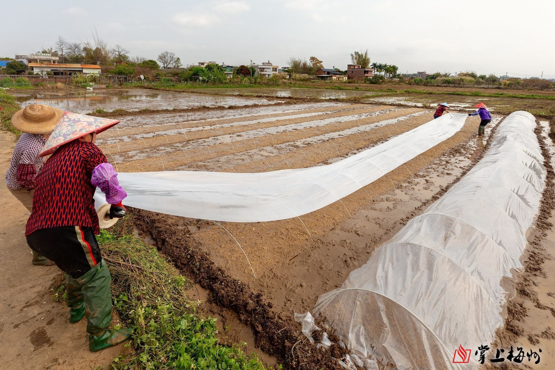 村民正忙着给秧苗覆盖薄膜。(连志城 摄)