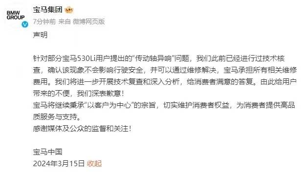 “3·15”晚会曝光宝马530Li车型传动轴异响后,宝马中国相关负责人对记者表示,针对部分宝马530Li用户提出的“传动轴异响”问题,我司此前已经进行过技术核查,确认该现象不会影响行驶安全,并可以通过维修解决,宝马承担所有相关维修费用。