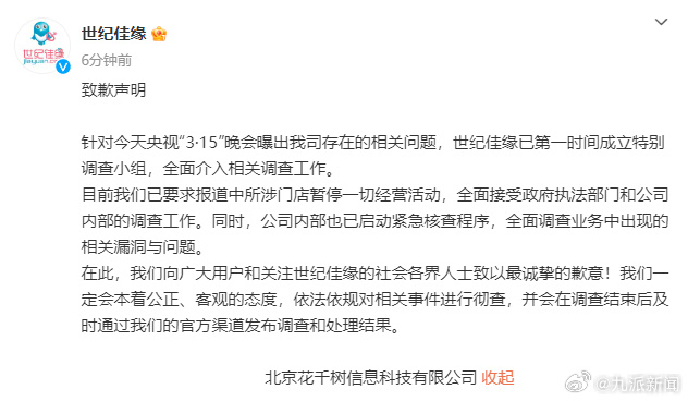 世纪佳缘发布致歉声明称,针对今天央视“3·15”晚会曝出我司存在的相关问题,世纪佳缘已第一时间成立特别调查小组,全面介入相关调查工作。