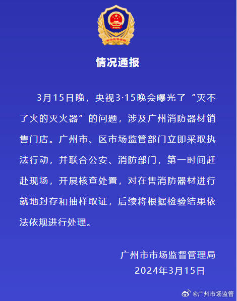 3月15日晚,央视3·15晚会曝光了“灭不了火的灭火器”的问题,涉及广州消防器材销售门店。对此,广州市、区市场监管部门立即采取执法行动,并联合公安、消防部门,第一时间赶赴现场,开展核查处置,对在售消防器材进行就地封存和抽样取证,后续将根据检验结果依法依规进行处理。(@广州市场监管)