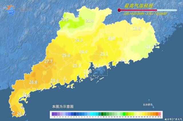 15日白天我省最高气温:粤北市县16℃~18℃,其余市县介于19℃~24℃,其中湛江徐闻站录得全省最高气温26℃。16日早晨,我省最低气温普遍上升了1~3℃,最低气温具体分布:韶关、清远、河源北部和粤东沿海市县14℃~17℃,雷州半岛20℃~22℃,其余市县17℃~20℃,其中韶关乳源录得全省最低气温14.4℃。
