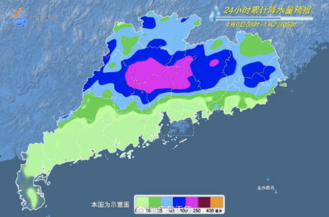 4月6日,粤北、珠三角东部市县有暴雨局部大暴雨,粤东和珠三角其余市县有大雨局部(大)暴雨,其余市县有(雷)阵雨局部大雨。