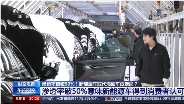 中国汽车流通协会乘联分会秘书长 崔东树:渗透率首超50%的话,目前意味着新能源车得到了消费者的日益的认可。而且新能源车产品的性价比已经达到了主流消费者接受的程度。证明了整个新能源车未来的发展潜力还是比较大的,呈现持续逐步上升的态势。未来新能源车成为我们消费主流是必然趋势。