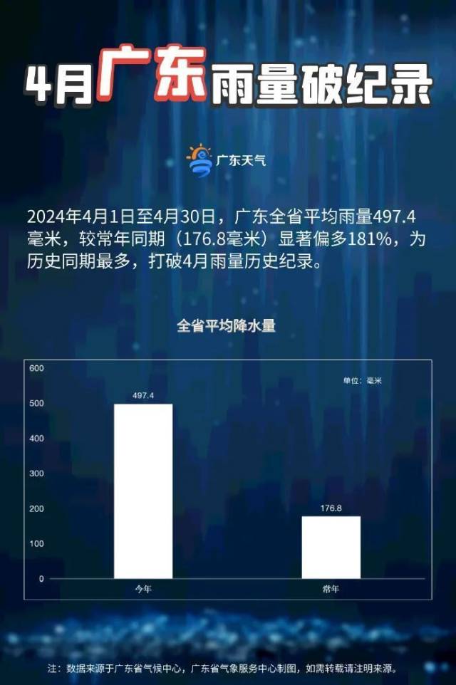 据广东气象部门统计,4月份广东全省平均降雨量497.4毫米,打破4月雨量历史纪录,韶关、河源、惠州、梅州、广州等地累计降雨量较常年同期偏多3~4倍。
