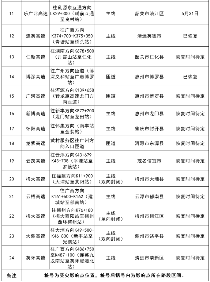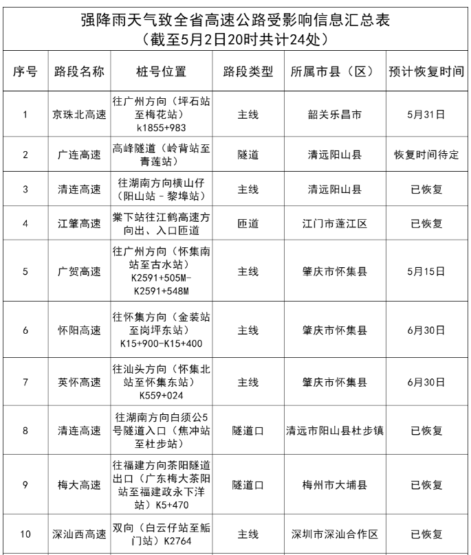 近期,受持续性强降雨影响,广东省部分地区高速公路、普通国省道受损。截至5月2日20时,高速公路受影响路段共计24处,较4月30日新增5处。已恢复7处,剩余17处仍未恢复,其中:主线双向封闭2处(梅大高速茶阳段、大潮高速往梅州方向新丰至光德段和往潮州方向高陂至新丰段),主线单向封闭1处(梅大高速往梅州方向西阳段),部分车道受影响14处。普通国省道受影响路段剩余7处仍处于双向交通管制状态。