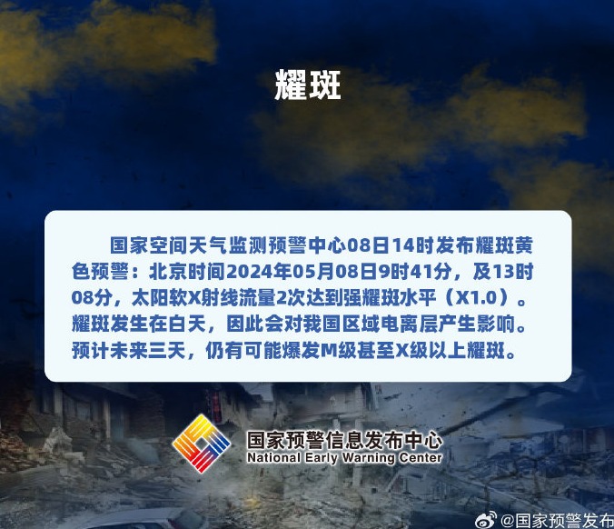 国家空间天气监测预警中心08日14时发布耀斑黄色预警:北京时间2024年05月08日9时41分,及13时08分,太阳软X射线流量2次达到强耀斑水平(X1.0)。耀斑发生在白天,因此会对我国区域电离层产生影响。预计未来三天,仍有可能爆发M级甚至X级以上耀斑。