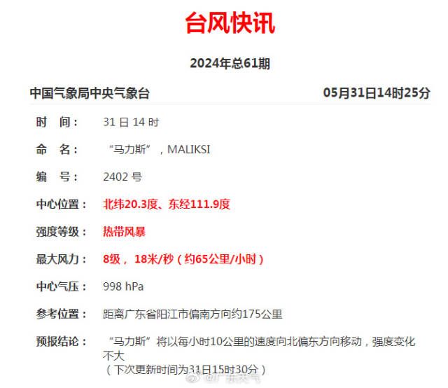 5月31日14时,南海热带低压加强为今年第2号台风“马力斯”(热带风暴级,英文名:Maliksi;名字来源:菲律宾;意义:菲律宾语,快速的意思),其中心位于阳江偏南方约140公里的粤西附近海面上,也就是北纬20.3度、东经111.9度,中心附近最大风力8级(18米/秒),中心最低气压998百帕。预计,其将以15-20公里的时速向北偏东方向移动,强度变化不大,并于31日夜间以热带风暴(8级)的强度在电白到珠海一带沿海地区登陆。