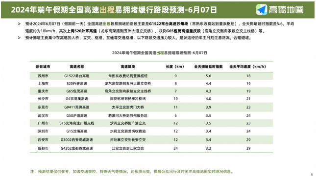 假期出行最怕的无疑就是堵在路上,报告预计,拥堵将主要集中在高速的大桥、立交、枢纽、互通等交通枢纽,其中6月7日(假期前一天)和6月8日(假期第一天)的全国高速出程最易拥堵缓行路段分别是G1522常台高速苏州段(常熟东收费站到董浜枢纽)和G93成渝环线高速重庆段(王家坪立交到青木关隧道) ,全天平均速度均不足20千米/小时。返程高速的最易拥堵路段则是G15沈海高速南通段(先锋收费站到苏通长江公路大桥) 。从全国高速易拥堵缓行路段的分布来看,南方高速的拥堵程度明显高于北方,其中苏州、重庆、广州的交通压力相对较大。