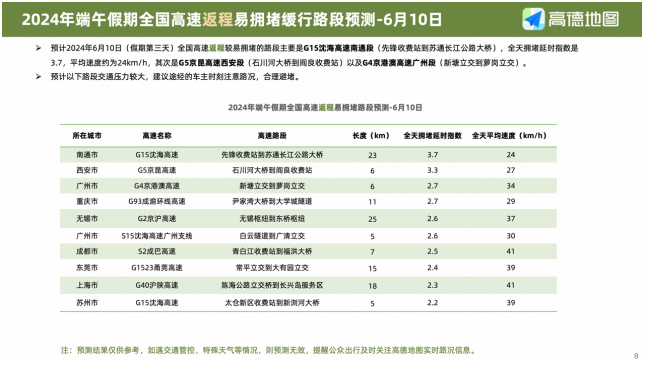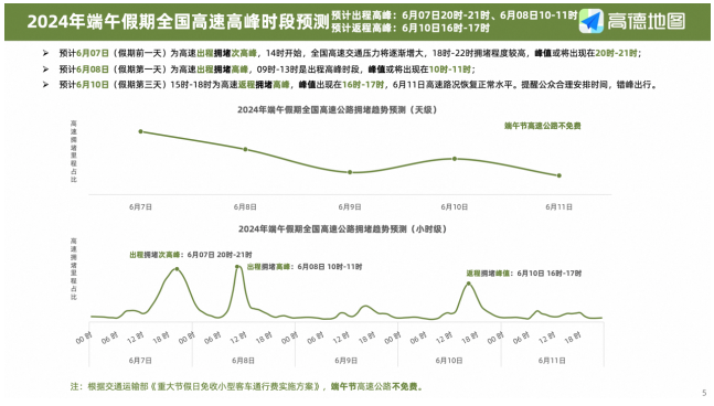 除了短途打车出行,自驾也是当下出游的主要出行方式,小长假自驾出行,合理规划出行时间和路线至关重要。高德地图联合多地交通管理部门发布《2024年端午小长假出行预测报告》(以下简称“《报告》”)就预测6月8日(假期第一天)为高速出程拥堵高峰,其中09时-13时是出程高峰时段,峰值或将出现在10时-11时。出程拥堵次高峰则出现在6月7日(假期前一天),从14时开始,全国高速交通压力将逐渐增大,其拥堵峰值或将出现在20时-21时。6月10日(假期第三天)15时-18时为高速返程拥堵高峰,峰值或将出现在16时-17时。