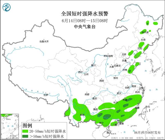 预计6月14日08时至15日08时,黑龙江南部、吉林中西部、辽宁西部和北部、山西东南部、河北南部和东北部、山东中东部和南部、河南中北部和东部、安徽北部、江苏北部、福建东南部、广西东北部、广东西北部等地的部分地区将有8级以上雷暴大风或冰雹天气,其中,辽宁北部和西部、山西东南部、河北南部和东北部、山东中南部等地的局地将有10级以上雷暴大风,最大风力可达11级以上;黑龙江南部和中东部、吉林南部和西北部、辽宁中东部和西南部、河北东北部、山东中东部和南部、湖南中南部、江西、浙江中南部、福建、四川南部、贵州东南部和西部、云南、广西、广东等地的部分地区将有小时雨量大于20毫米的短时强降水天气,其中,黑龙江中部、山东中南部、江西中东部、广西东部和北部、广东中北部等地的局地小时雨量大于50毫米,最大可达80毫米以上。